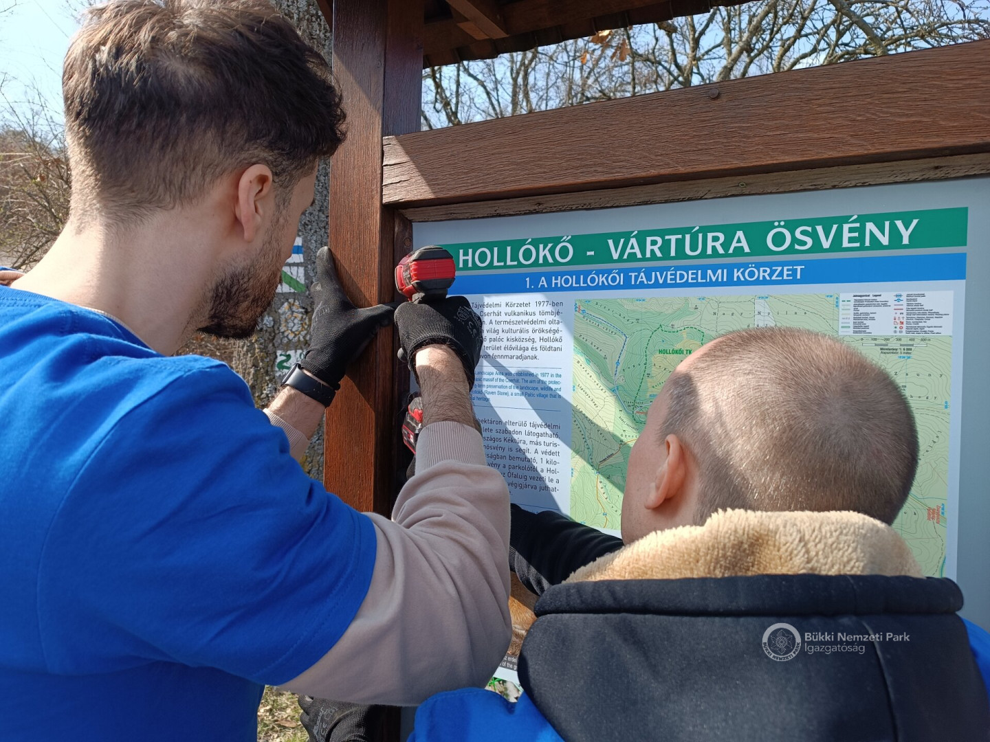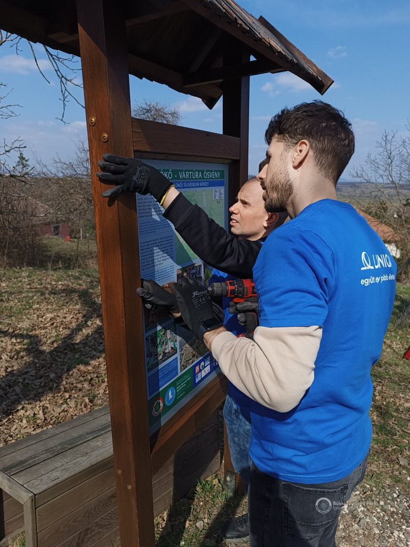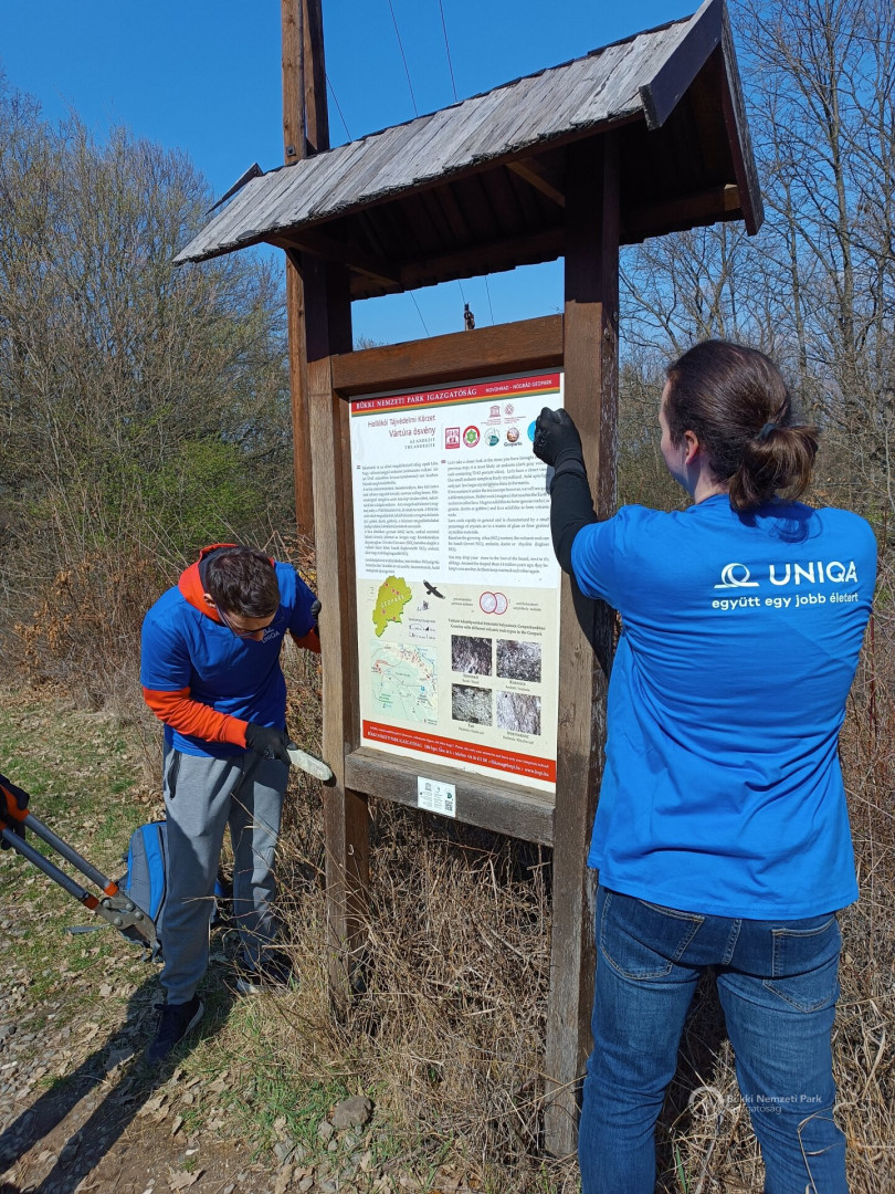 A Bükki Nemzeti Park Igazgatóság és az Uniqa Biztosító Zrt. közötti együttműködés első eseménye volt a március 27-ei akció, amely során az információs táblákat újakra cseréltük, a táblatartó szerkezeteket javítottuk, csiszoltuk és festettük, a nyomvonalat szemétmentesítettük és a felújításra váró tájházunk udvarát is rendbe tettük, sőt még gyümölcsfákat is ültettünk közösen. A 40 fős csapat nagyon lelkes és hatékony volt, így a húsvéti időszakban már egy megújult természetismereti tanösvénnyel fognak találkozni az idelátogatók, amely a biztosító törekvéseinek hírét is sokakhoz eljuttatja.