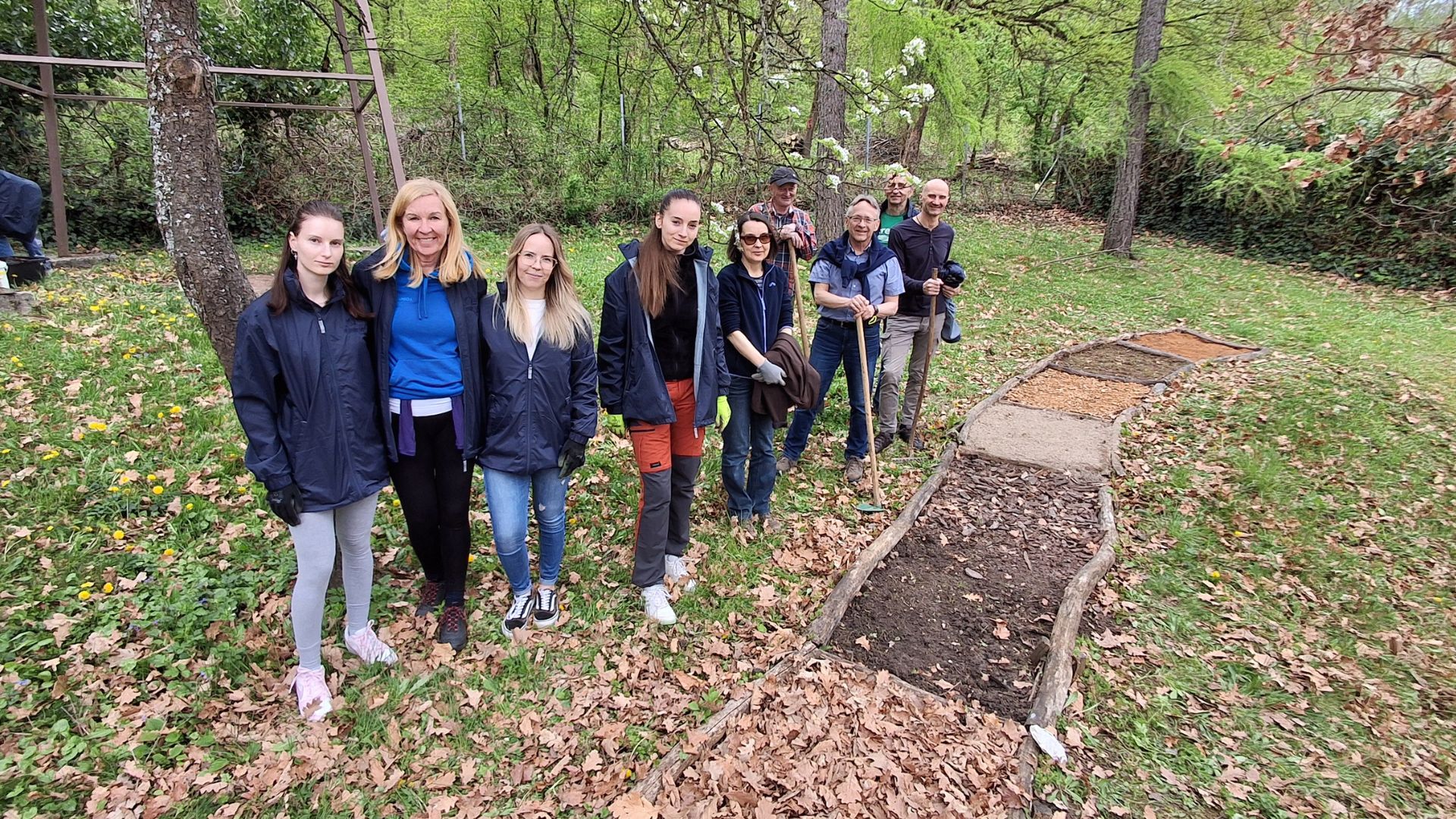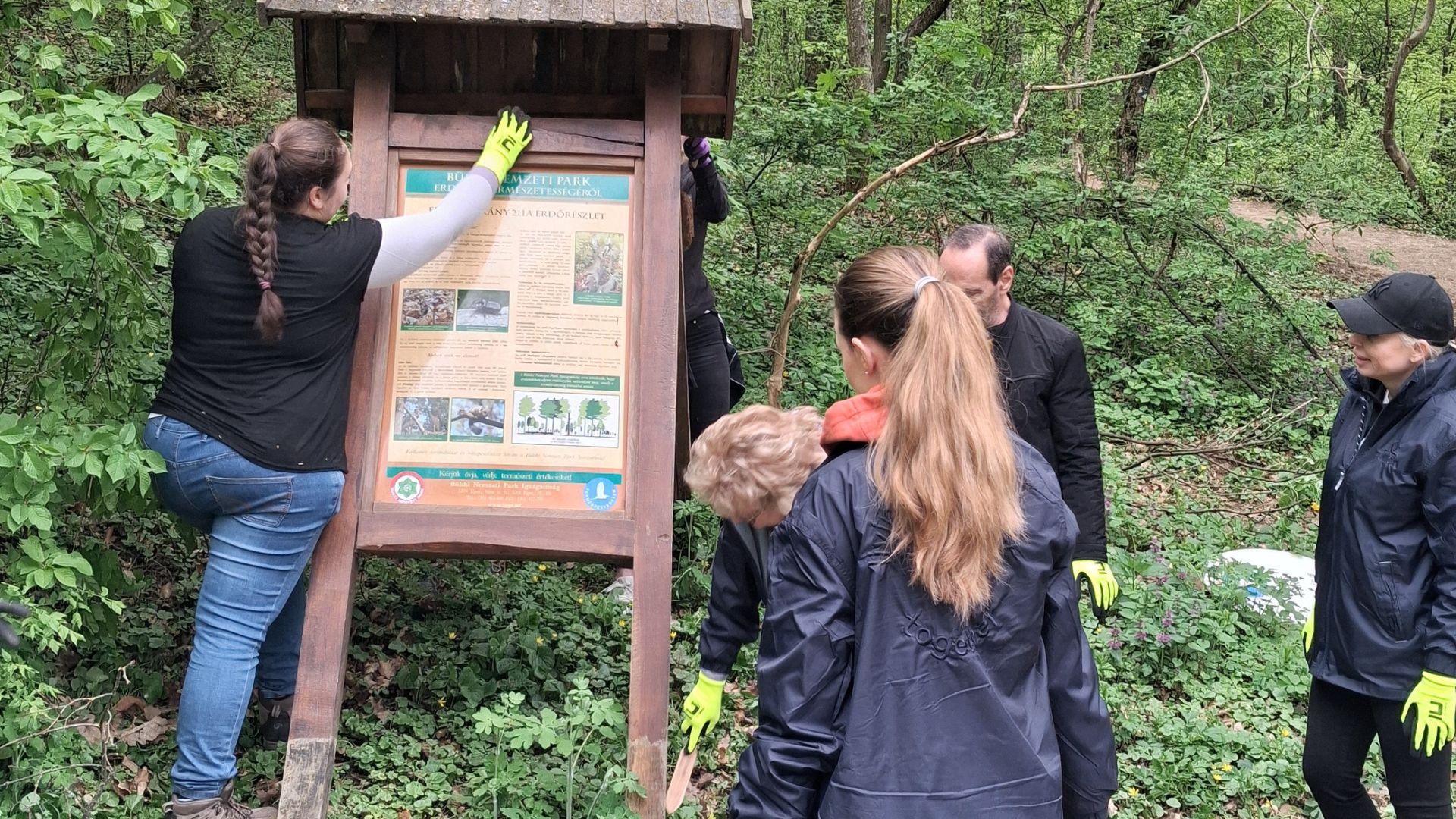 Bíró Tibor, az Ökoturisztikai és Környezeti Nevelési Osztály vezetője köszöntötte az önkénteseket, akiket kis pogácsával és kávéval vártak munkatársaink. A köszöntő után Kozma Attila, a Környezeti Nevelési Csoport vezetője tartott eligazítást a nap folyamán esedékes munkákról és a nap menetrendjéről. Ezután készült egy közös csoportkép, majd neki is kezdett a lelkes csapat a feladatoknak. Két nagyobb részre oszlott a társaság: az egyik a tanösvényt járta be és látott neki az ott esedékes munkáknak (tanösvénytáblák csiszolása, festése, illetve az egyik újraállítása), miközben a másik csapat a természetiskola udvarán szorgoskodott.