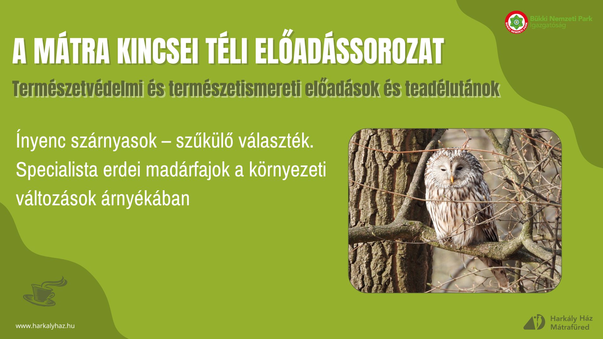 - A Mátra Kincsei téli előadássorozat - Ínyenc szárnyasok – szűkülő választék. Specialista erdei madárfajok a környezeti változások árnyékában